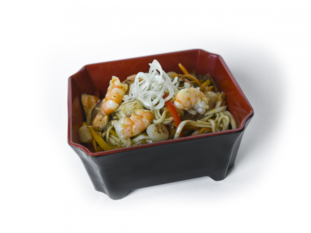 креветка, лосось, гребешок, морковь, перец болгарский, баклажан, лапша удон, лук
