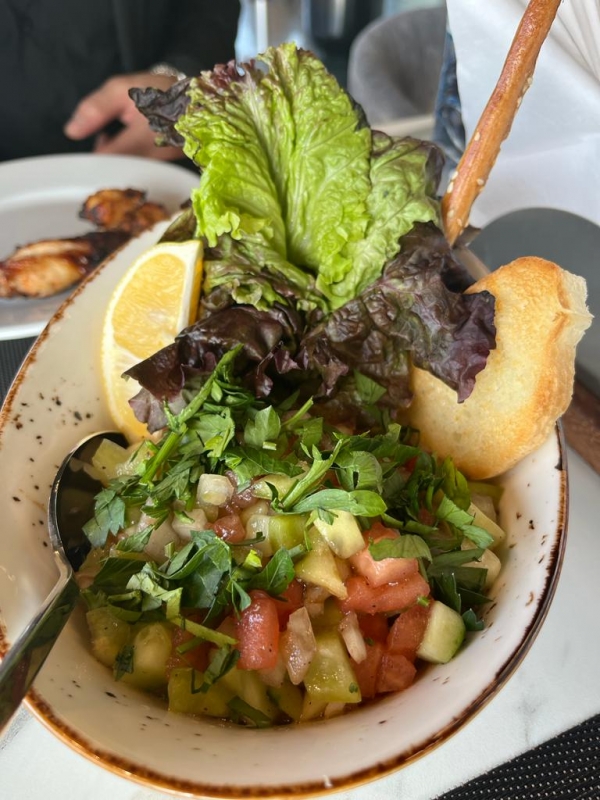 помидор, лук, огурцы, перец, петрушка, гранатовый соус, соль, черный перец