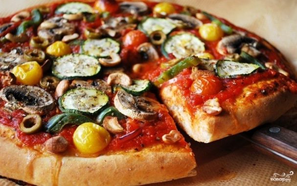 кабачки, баклажаны, перец, грибы, красный лук, томатный соус, Моцарелла, кукуруза, оливки черные, рукола