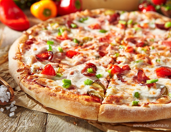томатный соус, Моцарелла, говяжий фарш, куриный фарш, колбаса, бастурма, кукуруза, черные оливки