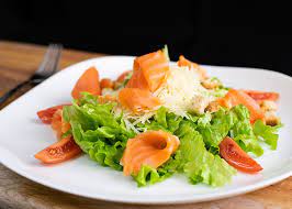 салат айсберг, соус цезарь, семга, пармезан, сухарики, черные оливки, помидоры черри