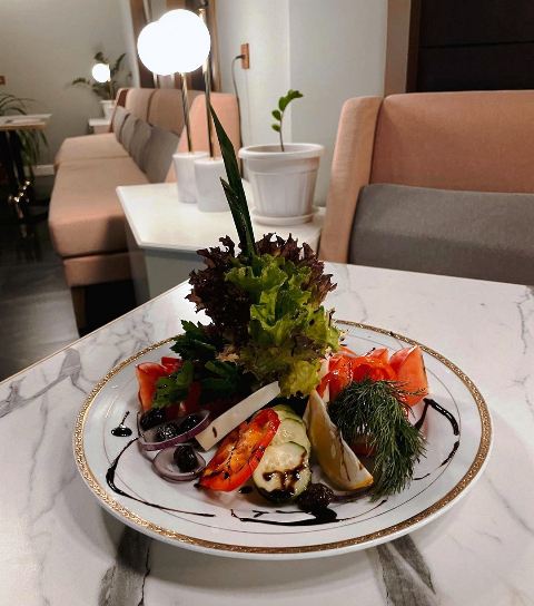 листья салата, петрушка, укроп, помидоры, огурцы, лук зеленый, перец, брынза, оливки черные