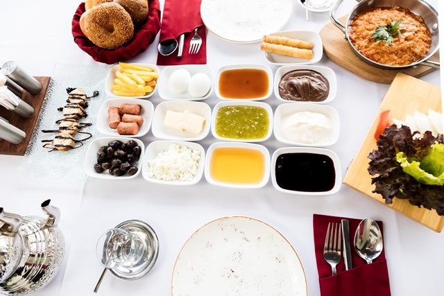 (4 вида варенья, мёд, брынза, моцарелла, творог, помидор, огурцы, черные оливки, оливки, сливочное масло, банановый сплит, менемен, яйца вареные, каша, нутелла, жареные сосиски, фри, хлебная корзина (симит,поча)