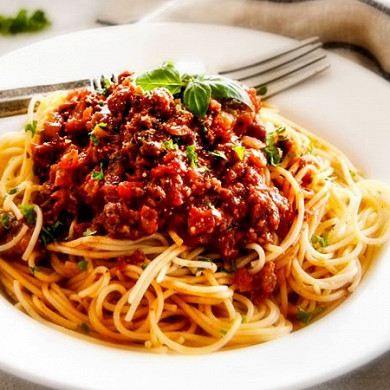 (говяжий фарш, помидор, морковь, лук, чеснок, томатная паста, черный перец, базилик, пармезан, соль, спагетти)