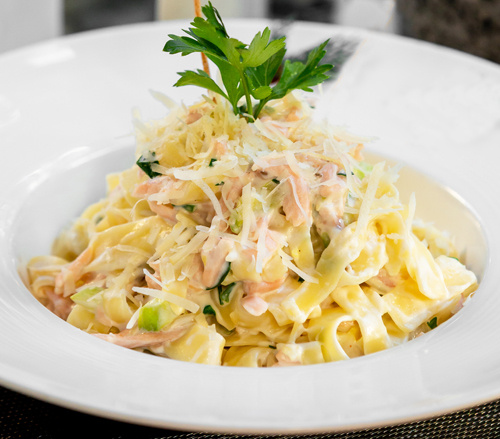 куриное филе, сливки, лук, чеснок, базилик, оливковое масло, пармезан, черри помидоры, фетучини