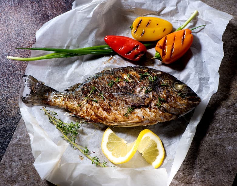 рыба на мангале, оливковое масло, лимон, черный перец ,соль ,сливочное масло