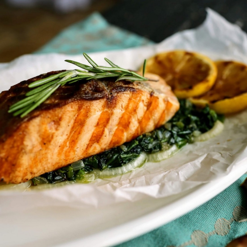 лосоcь на мангале, черный перец, лимон, оливковое масло, соль